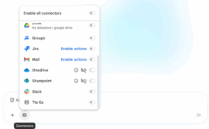이렇게 관리자에 의해 연결된 데이터는 실시간 채팅 화면에서도 손쉽게 제어 가능합니다. 사용자는 하단의 데이터 커넥트 아이콘을 통해 Google Drive, Calendar뿐만 아니라 SharePoint, OneDrive 등 다양한 외부 소스를 선택할 수 있습니다. 기업은 이를 통해 파편화된 사내 데이터를 안전하게 하나로 연결하고, 에이전트가 검증된 내부 문서만을 참고하도록 정교하게 제어할 수 있습니다.