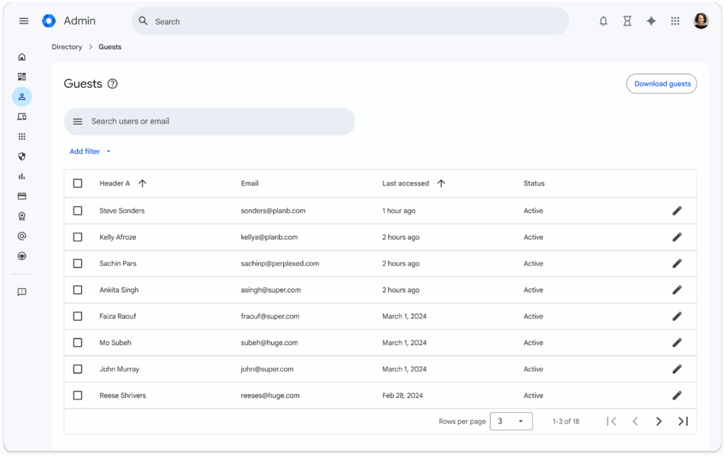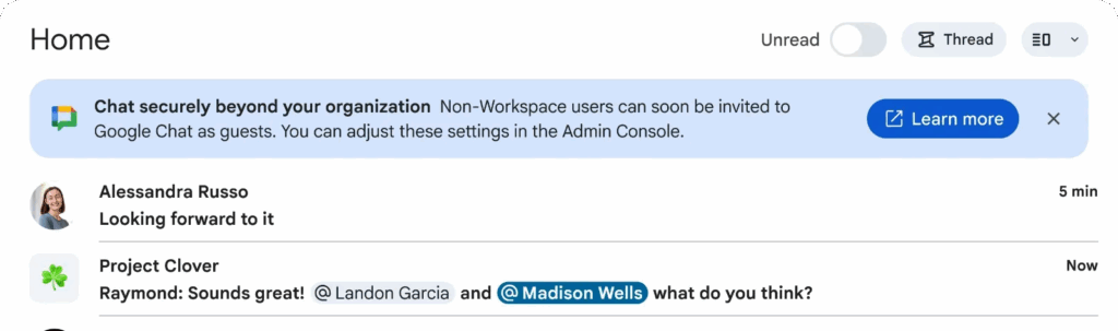 Workspace 관리자에게는 전체 가시성과 제어권이 부여됩니다. 게스트 계정 기능은 기존의 외부 채팅 설정과 연동됩니다. 조직 내에서 외부 채팅이 활성화되어 있는 경우, 사용자들은 이제 Chat에서 워크스페이스를 사용하지 않는 사용자를 초대하여 협업을 시작할 수 있습니다.